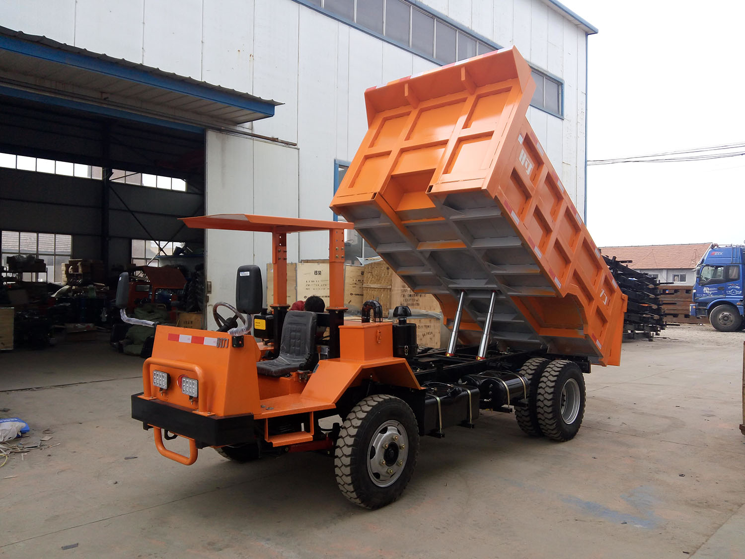 由料斗和行走底架組成。料斗裝在輪胎行走底架的前端部分,借助斗內(nèi)物料的重力或液壓缸推力傾翻卸料。卸料可按方位不同,分為前翻卸料、回轉(zhuǎn)卸料、側(cè)翻卸料、高支點(diǎn)卸料和舉升傾翻卸料等不同的方式。
